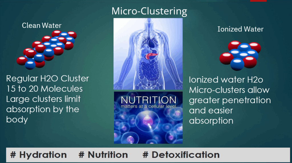 Kangen water transforms ordinary water through the process of electrolysis, altering its molecular structure. While normal water contains clusters of 15 to 20 or more molecules, Kangen water consists of only 4 to 6 molecules, forming micro-clusters. Due to its micro-clustered structure, Kangen water performs three major functions in the body: